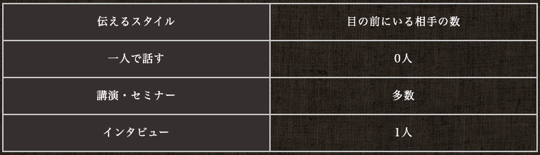 「一人で話す」「講演・セミナー」は、コンテンツを100%自分で構築しなくてはならないが、インタビューは「質問」に答えていくことで生み出していくもの。無理なく、想いや自身の魅力を伝えられる。口べたでもあきらめる必要はない。